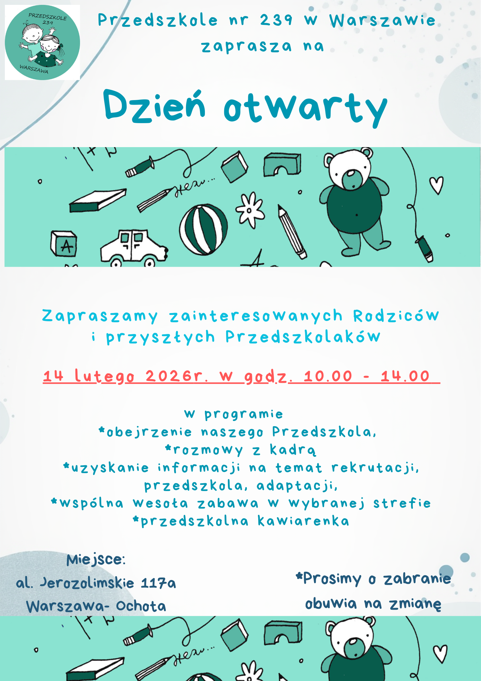 Dzień otwarty dla nowych Przedszkolaków i Rodziców : 14 luty 2026 r., godz. 10.00 - 14.00.